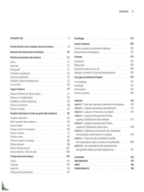 L'accent est mis sur l'emploi des oxydes colorants, qui donnent profondeur, transparence et variété de couleurs. Sont également présentés les composants des colorants de synthèse afin de pouvoir reproduire certaines teintes dans son atelier.