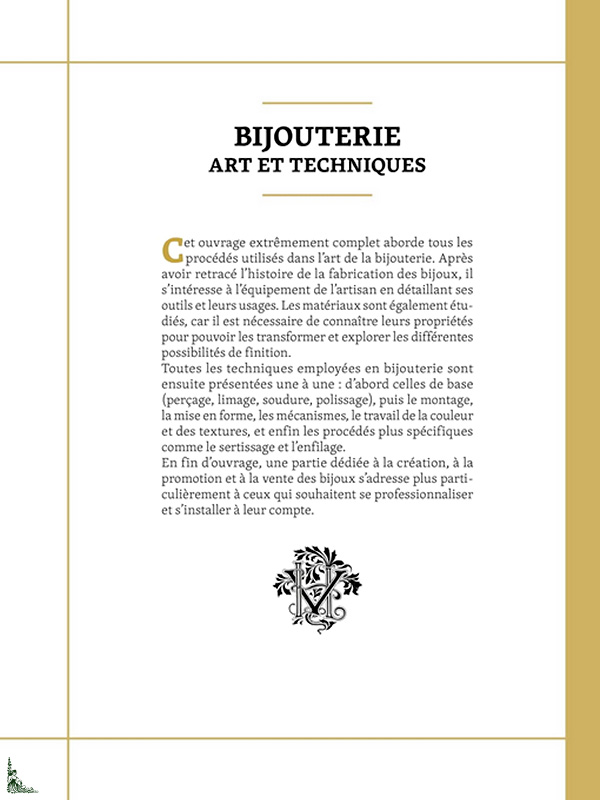 Très complet, ce livre montre étape par étape les principales techniques et matières utilisées pour la réalisation des bijoux. Procédés, matières et création y sont détaillés de manière claire et complète. Il fait office de guide et de manuel technique, destiné aux professionnels et aux amateurs désireux de connaître et de pratiquer cet art.